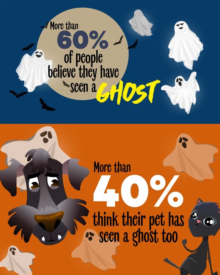 Feeling spooked? You’re not alone! According to a Halloween survey commissioned by Groupon, more than 60% of people have seen a ghost and 40% claim their pet has too! The survey was conducted by market researchers OnePoll where 2,000 were surveyed.